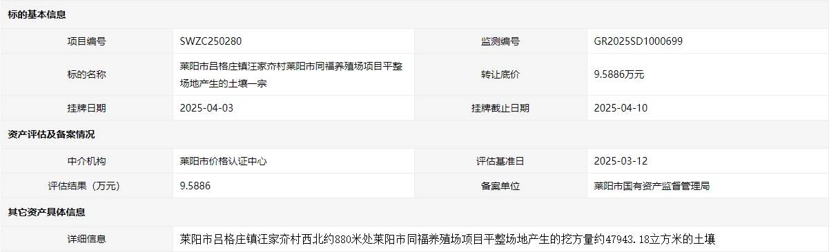 萊陽市呂格莊鎮(zhèn)汪家夼村萊陽市同福養(yǎng)殖場(chǎng)項(xiàng)目平整場(chǎng)地產(chǎn)生的土壤一宗