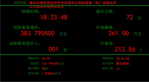 近日,萊州市稅務(wù)局經(jīng)濟(jì)開發(fā)區(qū)稅務(wù)分局所屬房屋建筑物及所占土地20年使用權(quán)轉(zhuǎn)讓項(xiàng)目在煙臺(tái)產(chǎn)權(quán)掛牌并有多個(gè)意向受讓方報(bào)名,最終,經(jīng)過72輪激烈報(bào)價(jià),項(xiàng)目較掛牌底價(jià)122萬元,增值261萬元,增值率高達(dá)212.56%,不但保證了疫情期間國(guó)有產(chǎn)權(quán)業(yè)務(wù)的正常開展,而且?guī)椭a(chǎn)權(quán)持有人實(shí)現(xiàn)了價(jià)值最大化。